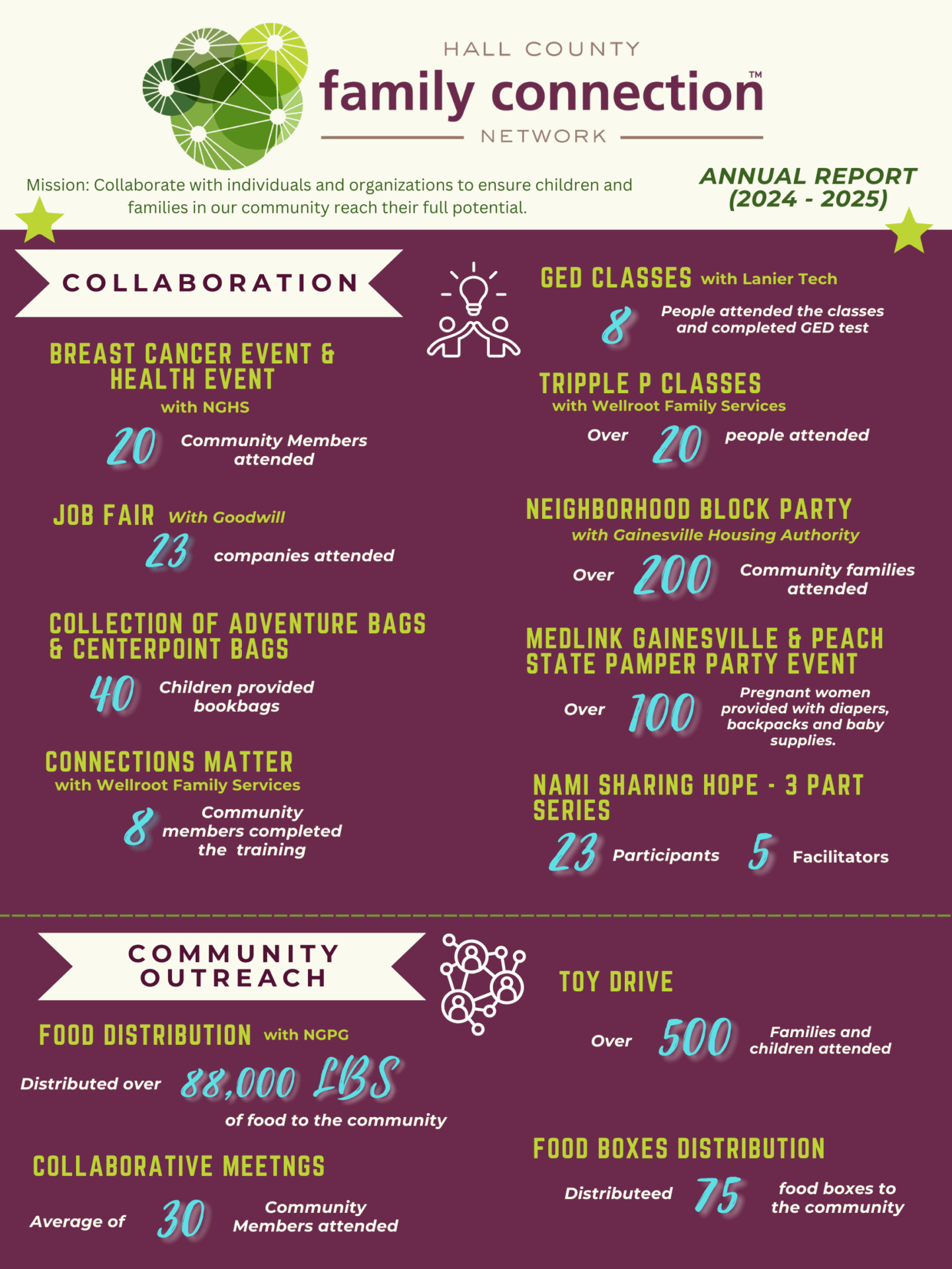 Hall County Family Connection Network (HCFCN) is a collaborative which serves as the local decision-making body, bringing community partners together to develop, implement, and evaluate plans that address the serious challenges facing the children and families in our county.